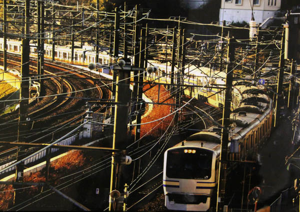 カーブを描いて光り輝くE217系のステンレス車体を美しく捉えた写真です。普段はうるさく感じる架線や架線柱もまるでクモの巣ようで面白い。