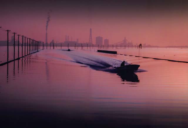 背景に工場のシルエットが映り、わきの電柱が長く続き、奥行き感のある作品になっ