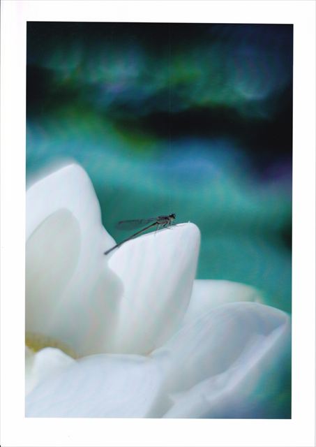 蓮の写真の中でも潔い作品です。思い切って花弁を断ち落としたデザインが新鮮で、アウトフォーカスになった景色のカラートーンが、白い花弁の美しさを引き立てました。時には思い切る感覚も必要です。